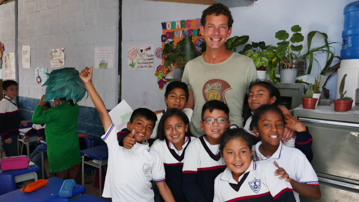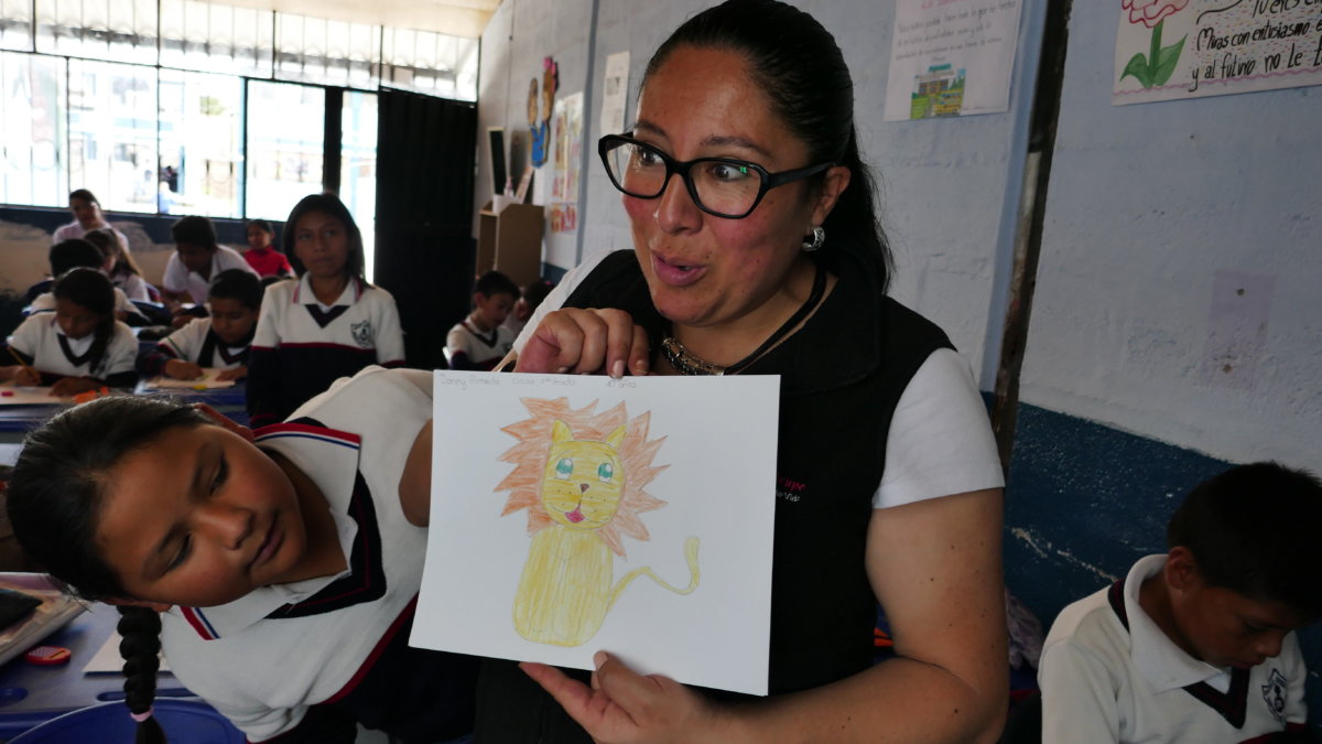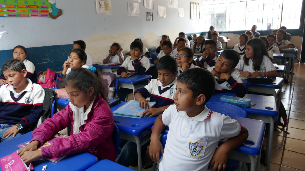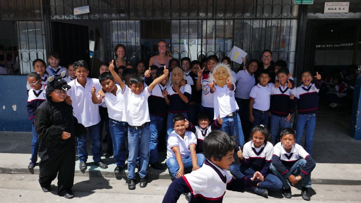 Durch Maria bekamen wir auch den Kontakt zu der Schule Unidad educativa Mariano Suárez Veintimilla in Ibarra, an der wir in einer 6. Klasse unser Projekt durchführen durften. Die Fundación Arupo arbeitet mit verschiedenen Schulen in der Umgebung zusammen, da Ecuador großen Wert auf Inklusion legt und so die beeinträchtigten Kinder in die Regelschulen integriert werden sollen. Nachdem wir die Schulleiterin in ihrem Büro begrüßt hatten und uns anschließend mit Hilfe von Maria in die uns zugeteilte 6. Klasse eingefunden hatten konnte unser Projekt beginnen. Wir durften auch hier in der Zeit des Englischunterrichts das Projekt durchführen, sodass wir sowohl Maria als auch einen sehr kompetenten Englischlehrer an unserer Seite hatten. Insgesamt hatten wir 36 Kinder im Altern von 9 bis 12 Jahren. In dem Klassenzimmer war es im Vergleich zu der Klasse in Kolumbien deutlich ruhiger, sodass die Kinder auch konzentrierter der Geschichte folgen konnten und ihren Spaß dabei hatten unsere Fragen zu beantworten. So schrieben wir wie auch schon bei allen bisherigen Projekten sowohl die Namen der jeweiligen Tiere an die Tafel als auch die Geschenke, die sie dem kleinen Käfer mitgegeben haben.
