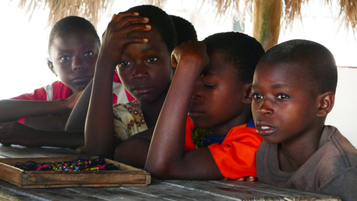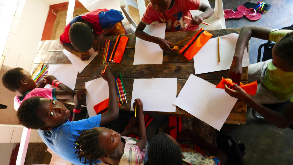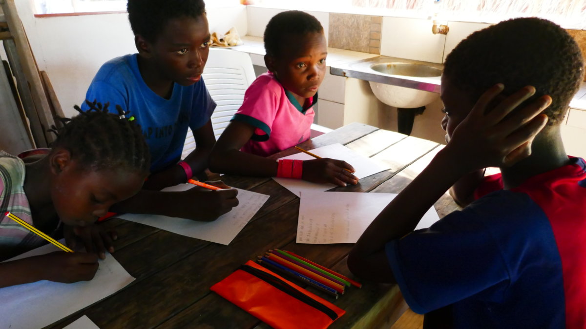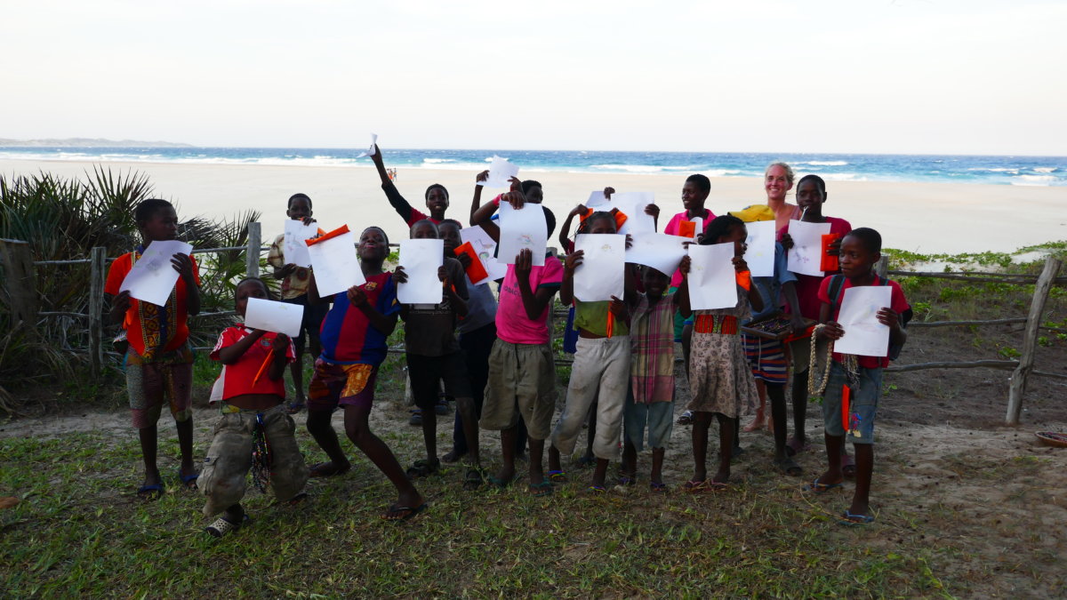 So überlegten wir uns das Projekt mit diesen Kindern durchzuführen. Ein wichtiger Bestandteil für eine erfolgreiche Durchführung war jedoch ein guter Dolmetscher, da die Landessprache in Mozambique nicht englisch wie in allen vorherigen Ländern sondern portugiesisch ist. Nachdem wir über ein paar Ecken einen netten jungen Mann gefunden hatten der die Geschichte vom kleinen Käfer Kribbel von englisch auf die lokale Sprache übersetzen konnte suchten wir eines Nachmittags die Kinder vom Strand zusammen und versammelten sie um zwei große Tische herum.