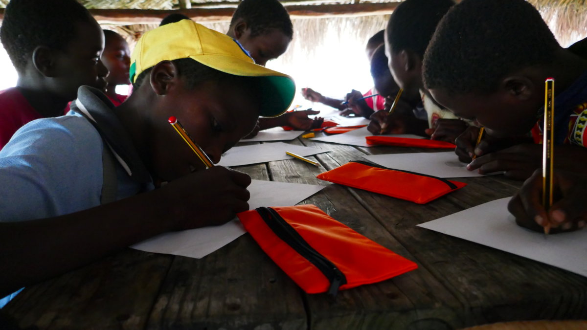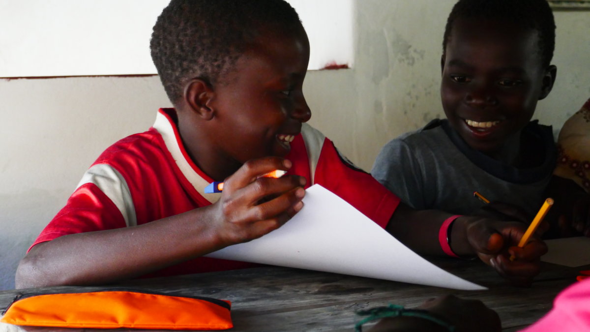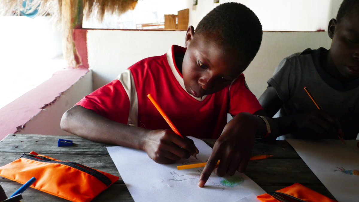 Bei der Gestaltung der Bilder zeigten sich wieder große Unterschiede zwischen den Kindern. Die einen malten einfach drauflos, natürlich wie alle anderen Kinder davor zunächst mit dem Bleistift. Andere Kinder hatten nach einer halben Stunde noch keinen einzigen Strich aufs Papier gebracht weil sie sich nicht trauten. Auch wenn die Kinder in Afrika wohnen haben die meisten von ihnen bislang kein einziges Tier aus dieser Geschichte in echt gesehen. Als beispielsweise ein Junge meinte er wäre fertig mit malen und uns eine Giraffe zeigte war diese nur mit Bleistift gemalt. Auf die Nachfrage hin ob die Giraffe denn grau sei wusste er keine Antwort. So zeigten wir ihm ein Bild von einer Giraffe und er malte daraufhin seine Zeichnung fröhlich mit passenden Farben aus.